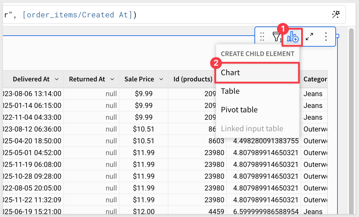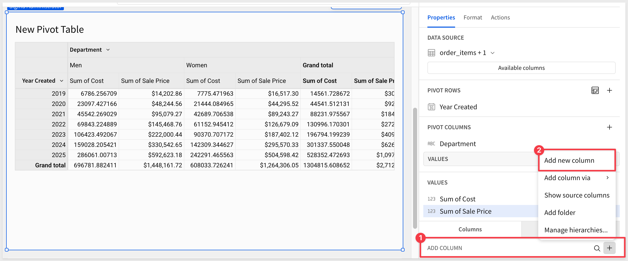We will create another child element from our order_items + 1 table but this time, select Pivot table.