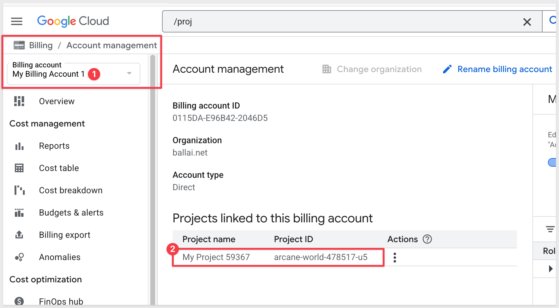 We need to provide the Billing project ID from GCP. That can be copied from this page in GCP, and clicking the Manage link: