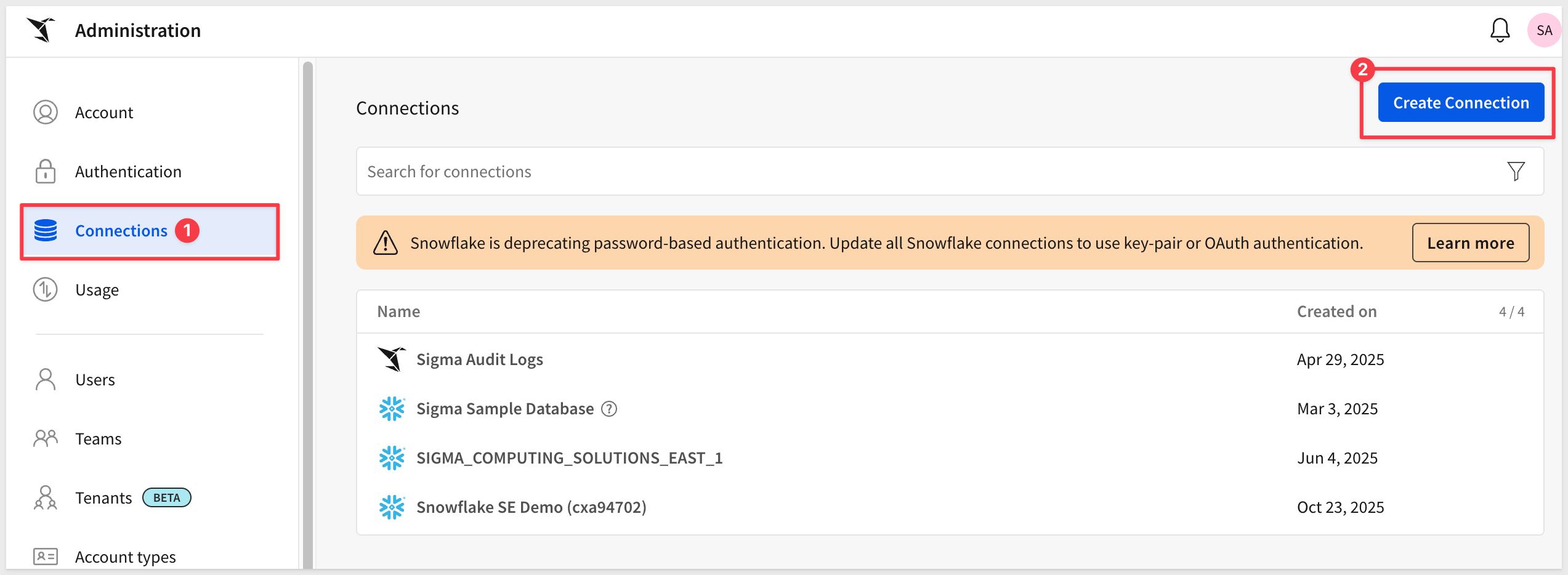 When done, click Create. Sigma will attempt to validate the connection is working or not. A message will appear upon success or failure.