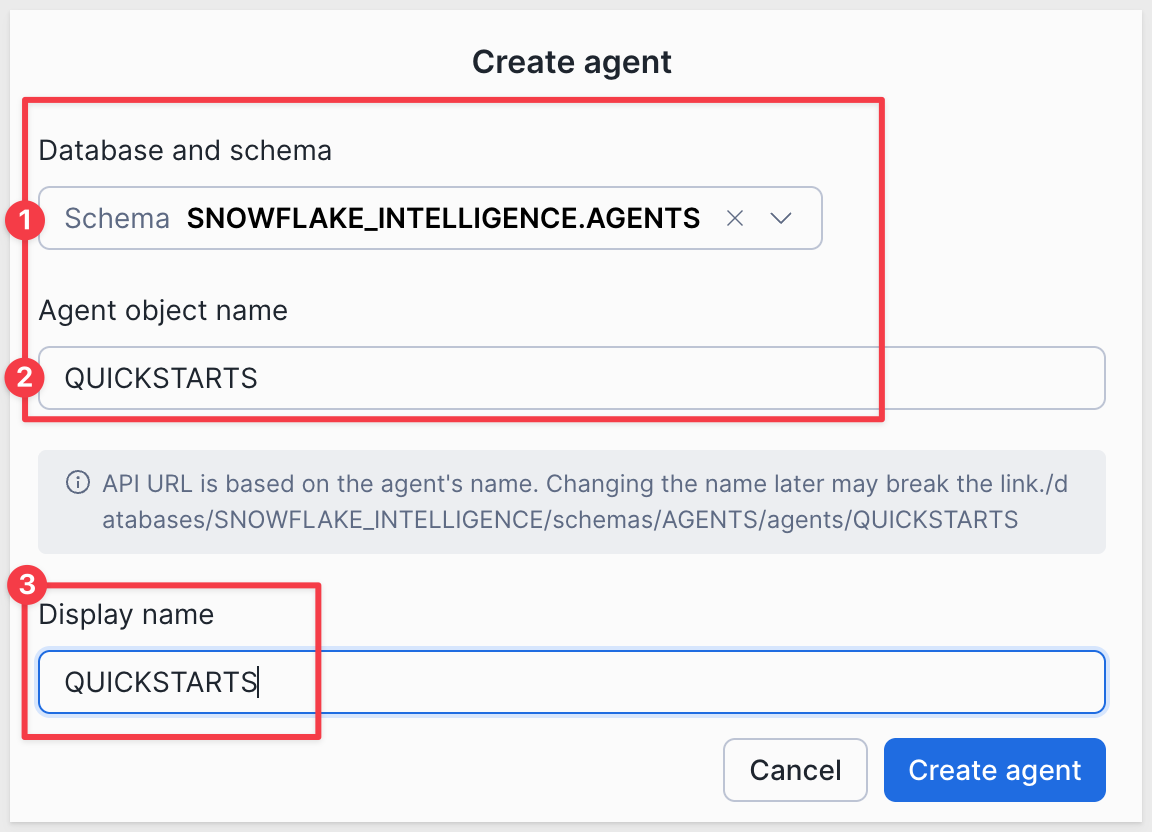 Set the database and schema as shown. the name and display name to QUICKSTARTS: