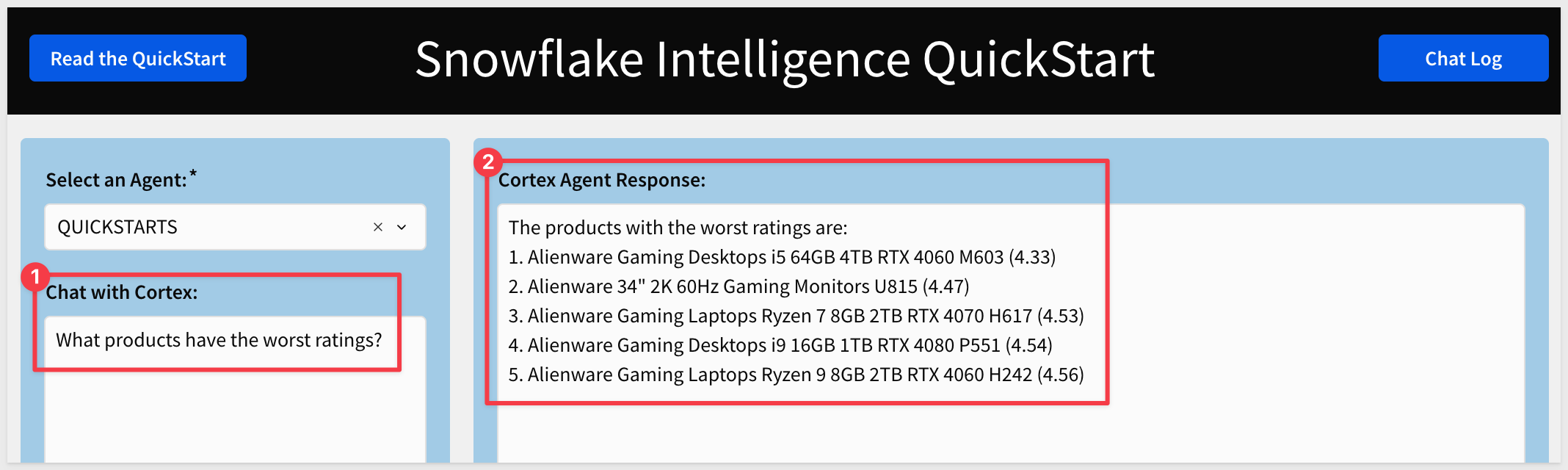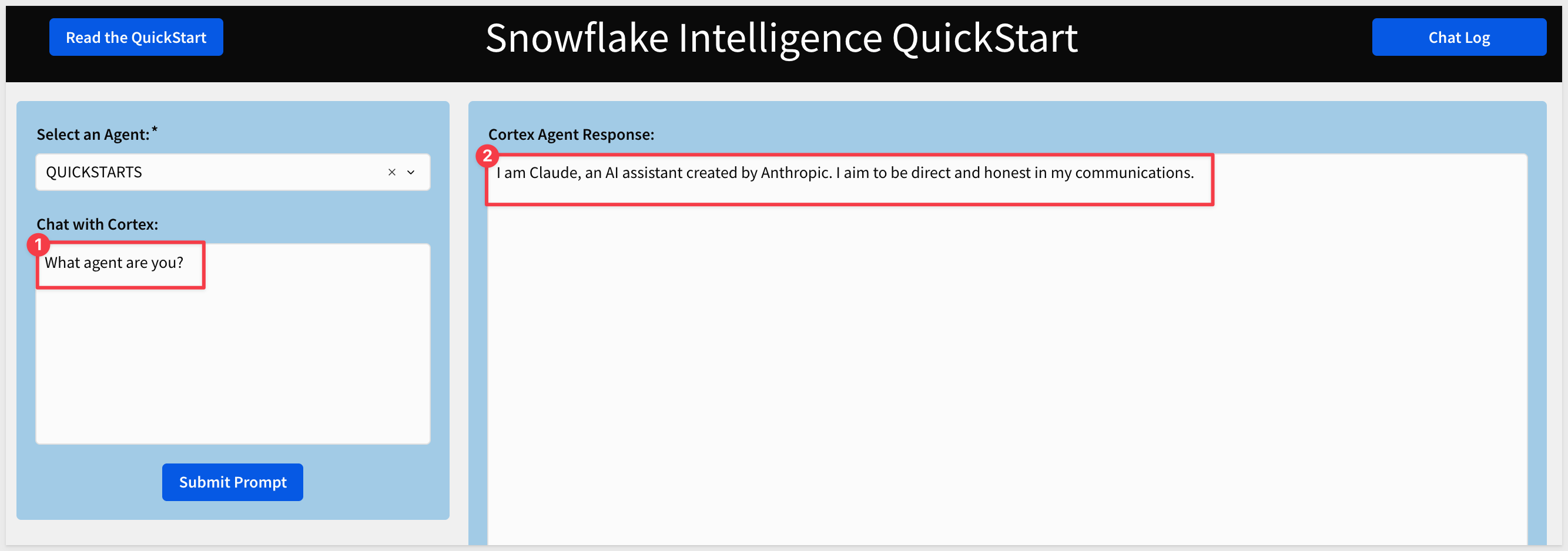 CALL SNOWFLAKE_INTELLIGENCE.AGENTS.CALL_CORTEX_AGENT_API('QUICKSTARTS', 'What agent are you?');