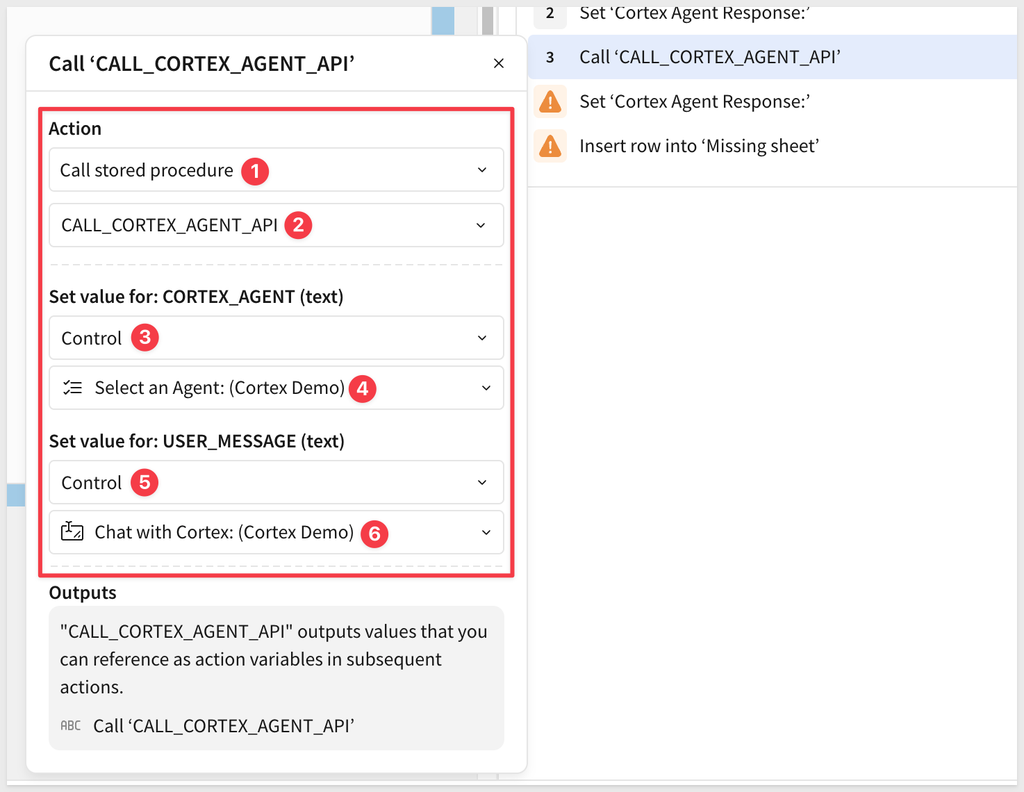 Check the configuration of the Call stored procedure action to make sure it can access the Snowflake stored procedure we created earlier: