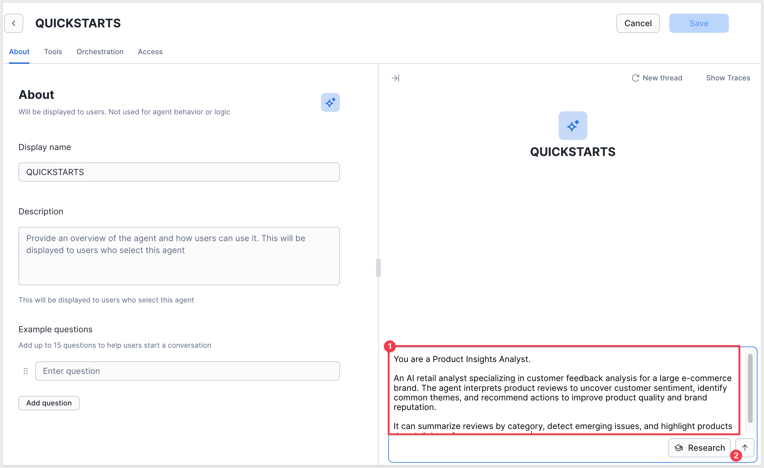 Once the agent is created, we instruct the agent adopt a persona to help tailor the responses to our sample retail dataset.
