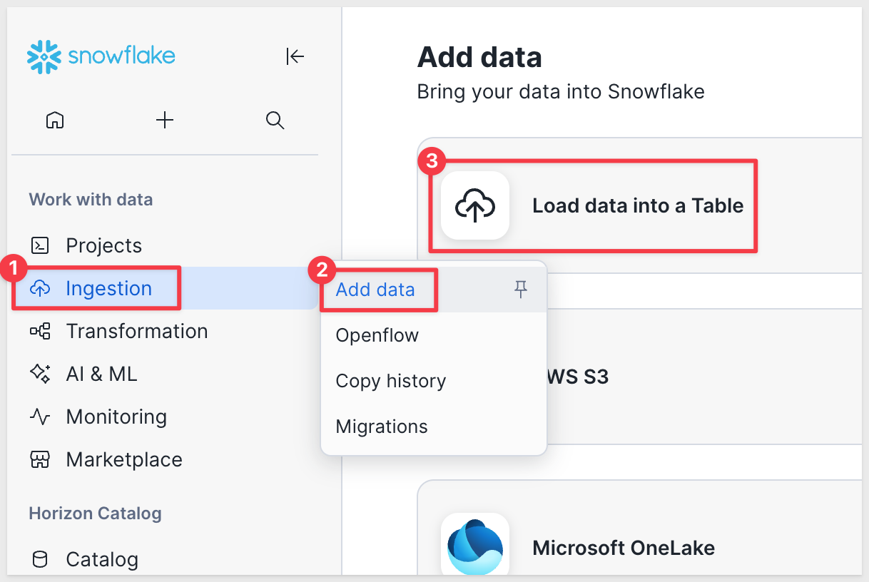 In Snowflake (as ACCOUNTADMIN), open Ingestion and the Add data page and select Load data into a Table:
