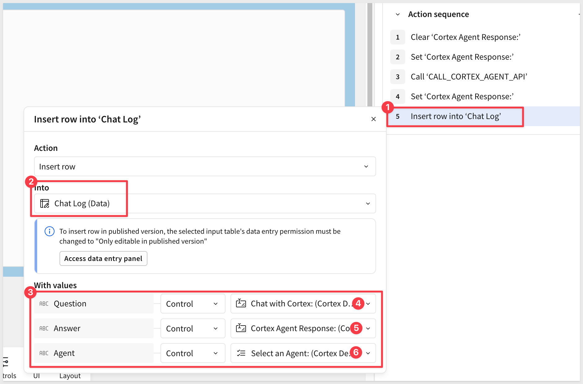 In the fifth action sequence, target the Chat Log (Data) input table with the following value assignments (check carefully!):
