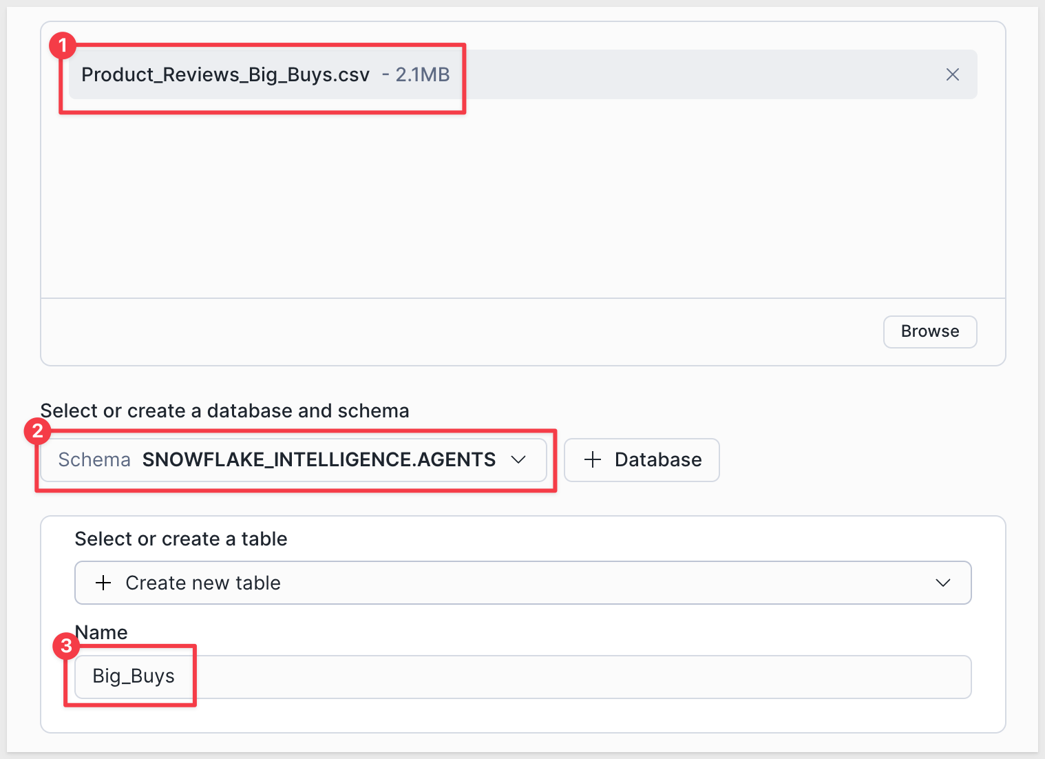 To keep this simple, we will store the data in SNOWFLAKE_INTELLIGENCE.AGENTS and create a new table called Big_Buys: