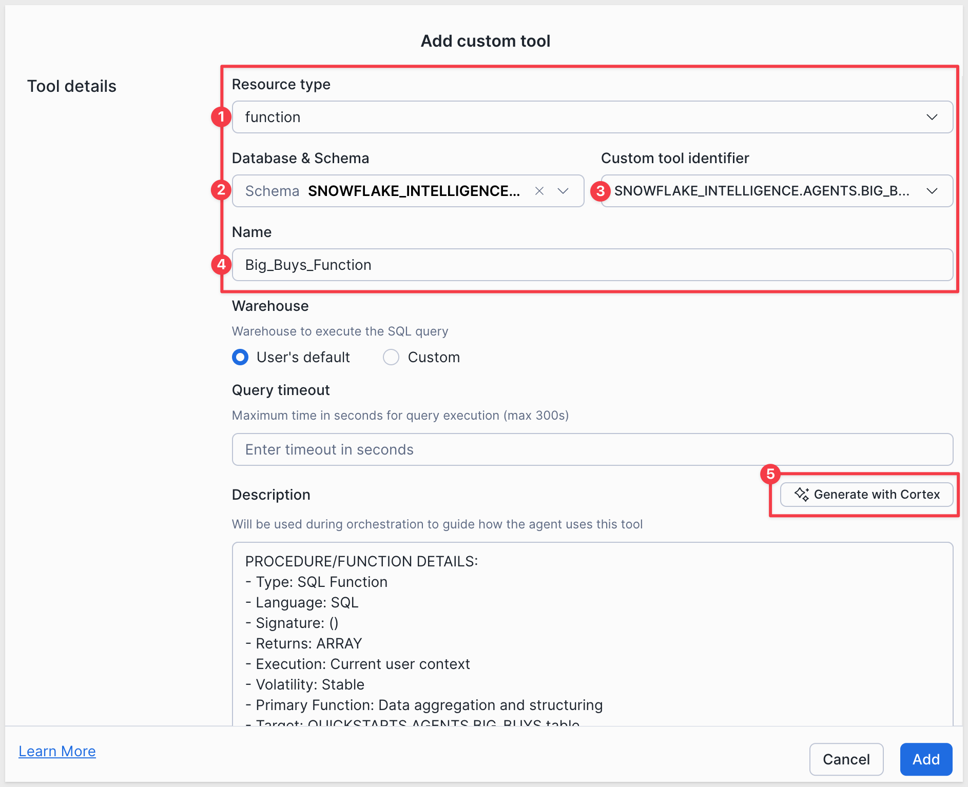 Configure a the tool to use the new function and click the Generate with Cortex button to let AI populate the Description: