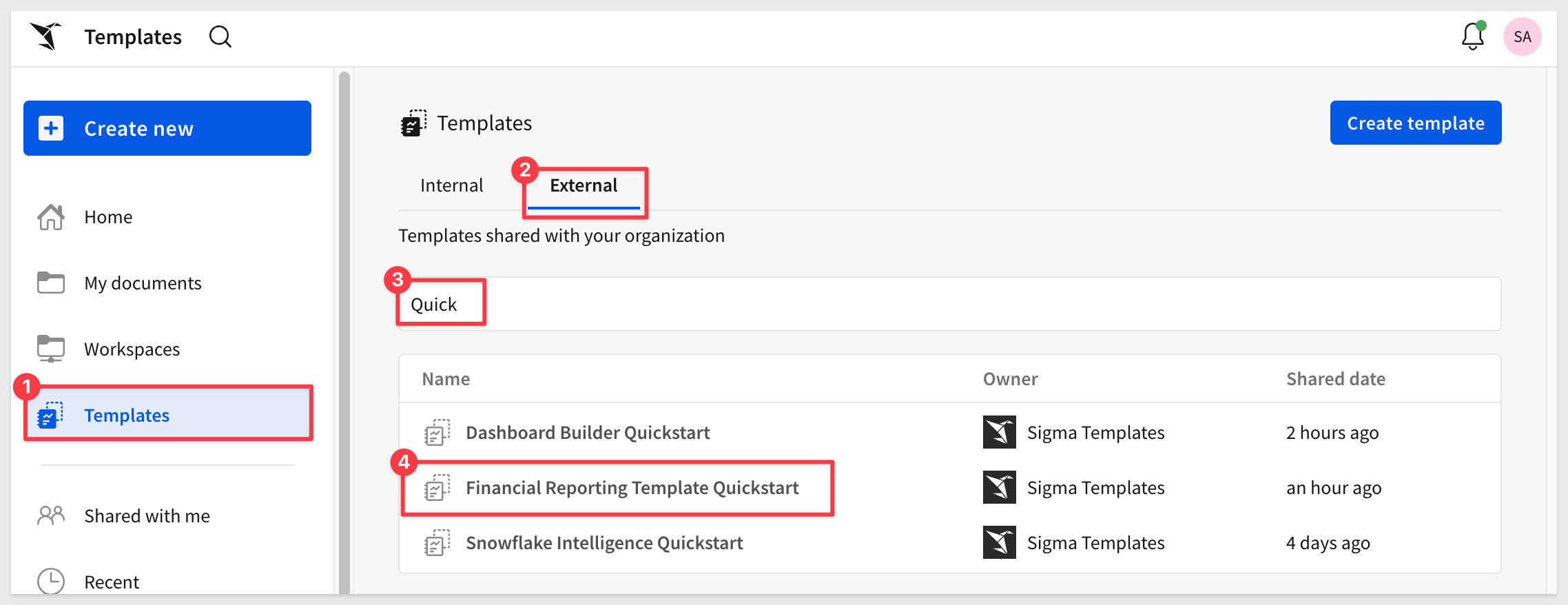 Return to the Sigma homepage and click Templates. Click to select the Financial Reporting Template Quickstart template: